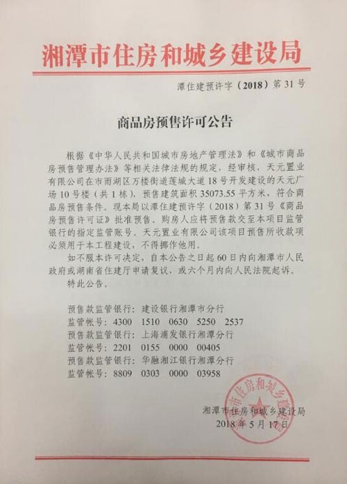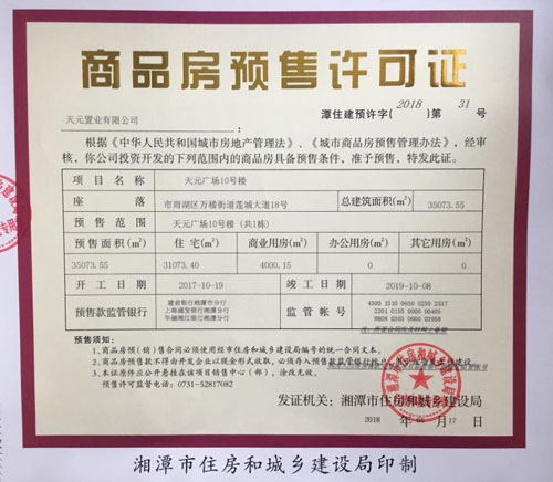 經(jīng)審核,天元置業(yè)有限公司在市雨湖區(qū)萬樓街道蓮城大道18號開發(fā)建設(shè)的天元廣場10號樓(共1棟),預(yù)售建筑面積35073.55平方米,符合商品房預(yù)售條件,現(xiàn)湘潭市住建局以潭住建預(yù)許字(2018)第31號《商品房預(yù)售許可證》批準預(yù)售。 |