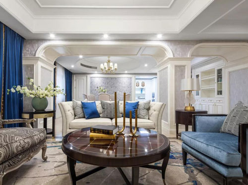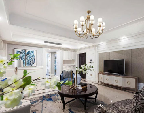 湘潭房產(chǎn)網(wǎng)訊 客廳區(qū)域設(shè)計(jì)師運(yùn)用木飾面與硬包結(jié)合,無論是從色彩上還是形態(tài)上都豐富了空間層次感,歐式的奢華格調(diào)也更為突出。
