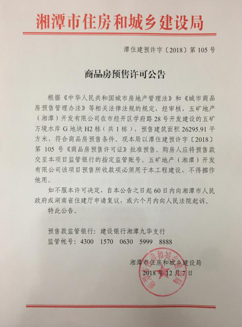 經(jīng)審核,五礦地產(chǎn)(湘潭)開發(fā)有限公司在市經(jīng)開區(qū)學(xué)府路28號(hào)開發(fā)建設(shè)的五礦萬境水岸G地塊H2棟(共1棟),預(yù)售建筑面積26295.91平方米,符合商品房預(yù)售條件,F(xiàn)湘潭市住建局以潭住建預(yù)許字(2018)第105號(hào)《商品房預(yù)售許可證》批準(zhǔn)預(yù)售。 |