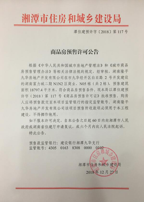 湖南富力城二期N1N2區(qū)商業(yè)、N05棟(共2棟)預(yù)售許可公告