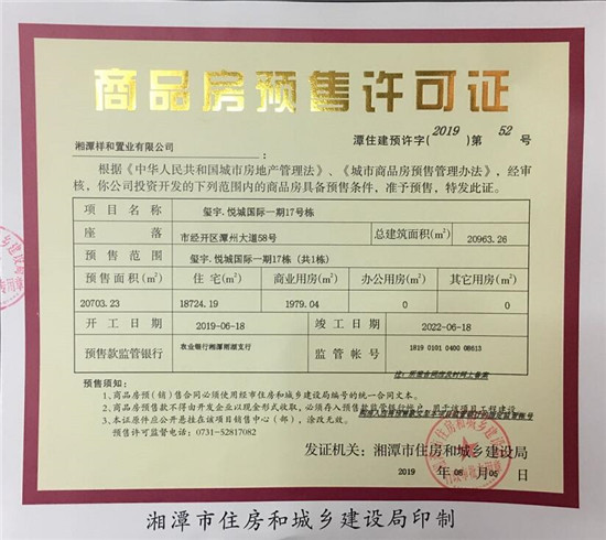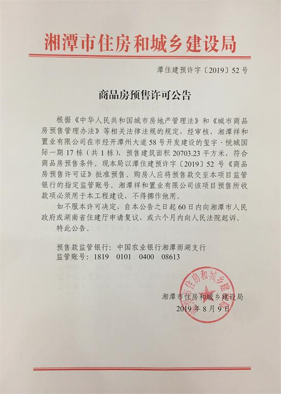 經審核,湘潭祥和置業(yè)有限公司在市經開區(qū)潭州大道58號開發(fā)建設的璽宇·悅城國際一期17棟(共1棟),預售建筑面積20703.23平方米,符合商品房預售條件,現(xiàn)本局以潭住建預許字[2019]第52號《商品房預售許可證》批準預售。