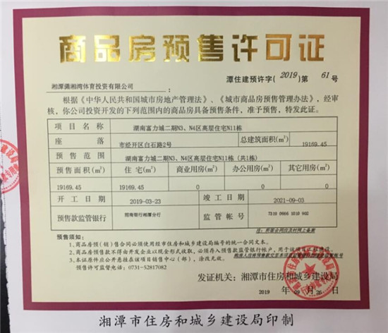 經(jīng)審核,湘潭瀟湘灣體育投資有限公司在市經(jīng)開區(qū)白石路2號開發(fā)建設(shè)的湖南富力城二期N3,N4區(qū)高層住宅N11棟(共1棟),預(yù)售建筑面積19169.45平方米。符合商品房預(yù)售條件,現(xiàn)本局以潭住建預(yù)許字【2019】第61號《商品房預(yù)售許可證》批準(zhǔn)預(yù)售。
