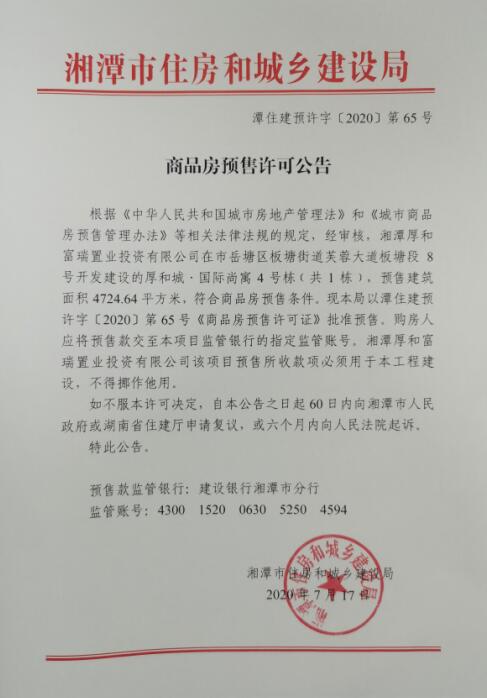 關(guān)于厚和城·國(guó)際尚寓4號(hào)棟(共1棟)預(yù)售許可公告